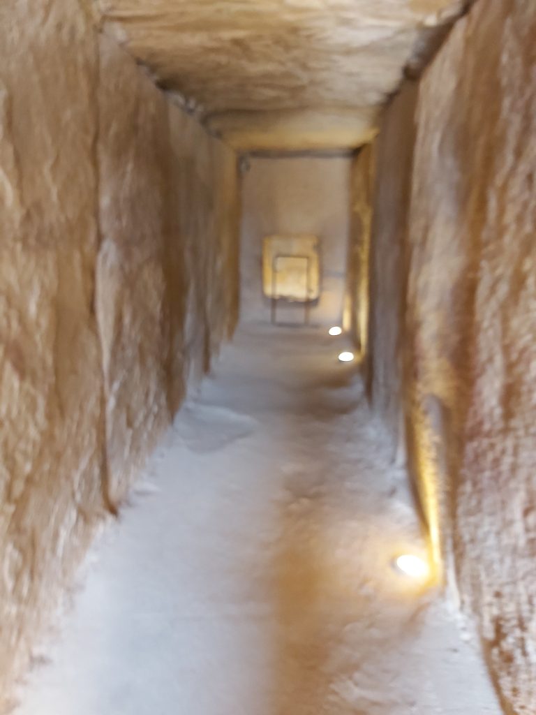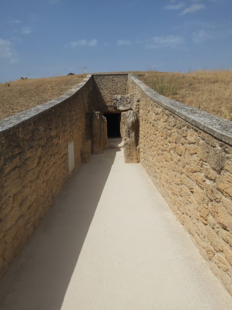Como decíamos, su conservación es notable. ¿Y respecto su tamaño? Ya hemos hablado de un túmulo de más de 70 metros de diámetro que alberga un tholos de 28 metros de largo en total (desde la apertura hasta el final de la segunda cámara). Una verdadera estructura gigante. ¿Y su datación? Tardía, alrededor del 2.200 a.C., aunque hasta hace poco decíamos que era del 1.700 a. C.