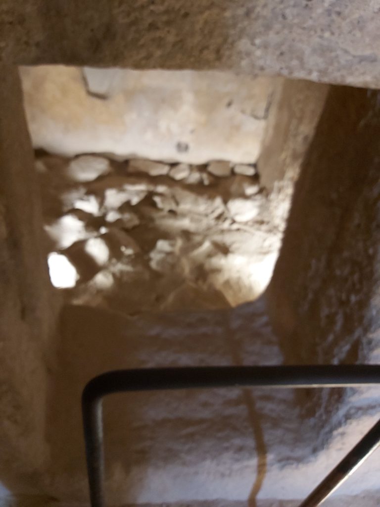 Pero El gran Tholos del Romeral nos guarda una sorpresa tras esa gran cámara, ya he continúa con un pequeño pasillo que nos lleva a una segunda pequeña cámara circular, cerrada con una reja (para que los intrépidos no quieran pisarla físicamente) de un diámetro aproximado de 2,5 metros en la base, y una altura de 2,5 metros. Esta cámara, hermana pequeña de la anterior, posee una piedra de altar y un espejo para que se pueda vislumbrar la dimensión su espacio interior desde la reja.