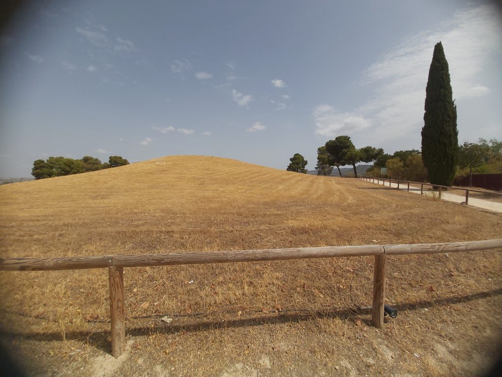 ¿Su ubicación? El Tholos de el Romeral se encuentra a las afueras de Antequera, a su este. En línea recta esta a poco más de un kilómetro de los dólmenes de Menga y Viera, aunque para llegar hay que cruzar varias rotondas y adentrarnos en un polígono industrial. Varias fábricas, los puentes del AVE y un depósito de deshechos a la entrada del recinto afean la primera impresión. Pero una vez que estamos en la zona protegida, en la que abundan los cipreses, y en el que el túmulo es omnipresente, se nos olvida todo lo anterior.