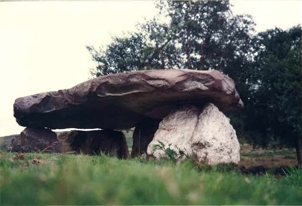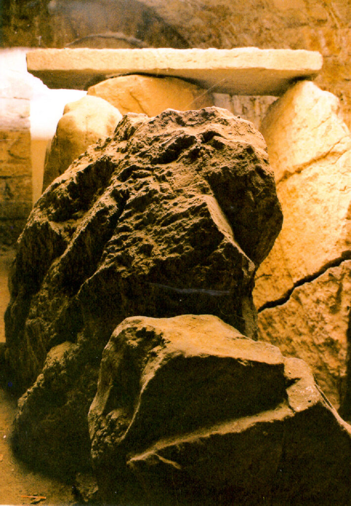 La demolición de la capilla original en 1632, es seguida por una reconstrucción y por acontecimientos históricos (cierre del templo por los franceses en 1808). Pero en 1851 Cortés realizó unas excavaciones que pusieron al descubierto unos ortostatos. En 1915 Cabré descubrió en cuatro de estas losas, en su cara interior, decoración en zig-zag de color rojizo, como las que existen en el Dolmen de Dombate, o en el Dolmen de Antelas (Portugal).