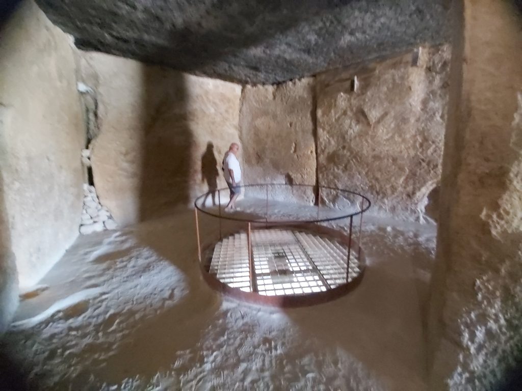 Pero El gran Tholos del Romeral nos guarda una sorpresa tras esa gran cámara, ya he continúa con un pequeño pasillo que nos lleva a una segunda pequeña cámara circular, cerrada con una reja (para que los intrépidos no quieran pisarla físicamente) de un diámetro aproximado de 2,5 metros en la base, y una altura de 2,5 metros. Esta cámara, hermana pequeña de la anterior, posee una piedra de altar y un espejo para que se pueda vislumbrar la dimensión su espacio interior desde la reja.