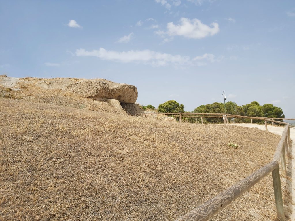 ¿Su ubicación? El Tholos de el Romeral se encuentra a las afueras de Antequera, a su este. En línea recta esta a poco más de un kilómetro de los dólmenes de Menga y Viera, aunque para llegar hay que cruzar varias rotondas y adentrarnos en un polígono industrial. Varias fábricas, los puentes del AVE y un depósito de deshechos a la entrada del recinto afean la primera impresión. Pero una vez que estamos en la zona protegida, en la que abundan los cipreses, y en el que el túmulo es omnipresente, se nos olvida todo lo anterior.
